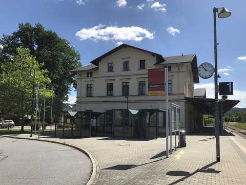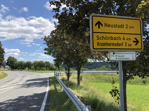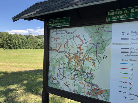 Prohlídka začíná na nádraží v Neustadtu. Jděte po Bahnhofstraße asi 100 m na sever a poté odbočte vlevo na Karl-Liebknecht-Straße. Pokračujte po této ulici, přejděte světelnou křižovatku a pokračujte po Maxim-Gorki-Straße. Asi po 700 m odbočte vlevo na Mittelweg. Po krátké době přejděte po pravé straně most přes řeku Polenz. Nyní se nacházíte na ulici Inselweg, po které pokračujte až na další křižovatku. Poté odbočte vlevo a hned zase vpravo. Tam se opět ocitnete na Mittelweg, kterou opustíte až po cca 800 m na "An der Lücke" vpravo. Nyní míříte k dědičnému dvoru Polenz, kde odbočíte doprava na ulici Polenztalstraße.Nyní se nacházíte na okružní cyklotrase Neustadt, která je označena "modrou tečkou na bílém podkladu". Z ulice Polenztalstraße odbočte vlevo na ulici Cunnersdorfer Straße, poté odbočte na Mittelweg a opět vlevo na Cunnersdorfer Straße. Po této silnici pokračujte až na Flämmigtweg, kde odbočte vlevo. Projděte kolem lesního koupaliště a sledujte značení až k silnici S 156. Zde odbočte vlevo. Po chvíli dojedete k odbočce na Krumhermsdorf, na kterou odbočíte. Nyní pokračujte po cestě až k hasičské stanici v Krumhermsdorfu. Tam odbočíte vlevo. Pojedete po silnici "Am Bahnhof" a před nádražím se držíte vlevo, abyste mohli pokračovat po cyklostezce. Pokud budete pokračovat po této cestě, dojedete po nějaké době na lesní parkoviště, kde můžete odbočit doprava a navštívit Unger a vystoupat na rozhlednu na Ungerbergu (537 m). Ať už s návštěvou Ungeru, nebo bez ní, pak budete na kole sjíždět z kopce až k silnici S 154. Tam pojedete krátký úsek po pravé straně státní silnice a poté se opět vydáte po cyklostezce po levé straně.