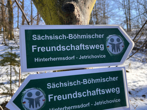 Jetřichovice - Kostelní stezka (Kirchweg) (modrá) - Hřebenovka (Kammweg) - Na Tokáni -Stezka Českem (modrá) - Stezka Českem (zelená) - hranice Hinterhermsdorfun) - Hinterhermsdorf/Hinterdittersbach hranice - Česká silnice (zelená) - Hřebenovka (hřebenová cesta) - Stezka Českem (modrá) - Jetřichovice