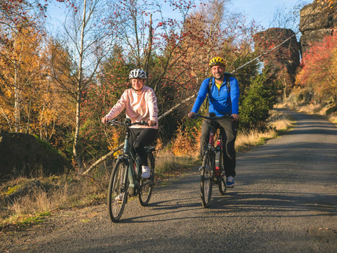 On this tour you can discover the Czech side of the Elbe Sandstone Mountains and the Elbe Valley. On weekends and public holidays from April to October, take your bike or e-bike and relax on the bicycle bus line 217 from Pirna via Berggießhübel and Bahratal or from Rosenthal, which will take you to Tisá in the Czech Republic.With its detours to the rocks of the Tiské stěny (Tysza Walls) and the Sněžník (High Snow Mountain) to the Elbe Valley of Saxon-Bohemian Switzerland, the bike tour becomes a pleasure tour. It can be shortened at will between the Czech-German border in the Elbe valley, as the route runs parallel to the S-Bahn line in the direction of Pirna on the Elbe cycle path.