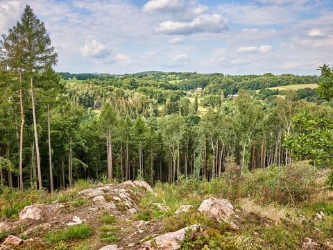 From the historic market in Bad Gottleuba, the hike leads up to the Tannenbusch. The Tannebusch got its name because of the spruces that used to grow there. These were commonly referred to as fir trees. After the devastating storms "Herwert" and "Frederike" in 2017 and 2018, major damage occurred here. The drought in the following years served as an entry point for the bark beetle. Due to the lack of water and thus the lack of resin in the pure spruce stands, the bark beetle was able to multiply explosively. The result was the complete death of the spruces on the Tannenbusch. The state enterprise Sachsenforst, in cooperation with the town of Bad Gottleuba-Berggießhübel, has drawn up a plan to plant the resulting bare areas with various tree species. The new panels show how the bare areas caused by the bark beetle are revitalised with new tree species, thus bringing a new forest to life. From the ridge trail you can enjoy great views of the Gottleuba Valley.