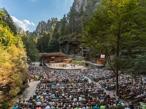 Rocks also line the path up to the Bastei. Here we briefly leave the Malerweg and ascend on a short path via the Höllengrund to the Bastei. With its particularly impressive landscape, the Bastei area has always offered a wealth of artistic motifs. Caspar David Friedrich also immortalized it in some of his works. After the ascent over the Höllengrund, we reach the resting place "Stone Table" again on the Malerweg and follow from here the Fremdenweg to the famous Bastei. A wealth of views is offered here. One should not miss the Ferdinandaussicht and the viewing platform above the Bastei Bridge. The path then leads down to the spa town of Rathen via the Malerweg. A visit to the Felsenbühne Rathen to conclude this tour is highly recommended. The Felsenbühne Rathen is considered one of the most impressive natural stages in Europe – and is closely connected to Carl Maria von Weber. Especially his opera "Der Freischütz," regarded as the epitome of romantic German opera, has been performed here for decades. The wild rocky landscape and the mystical forests around Rathen form a perfect backdrop for the Wolfsschlucht scene, which seems made for this place. Thus, Weber's music is uniquely united with nature here – an experience that immediately transports one into the world of romanticism.