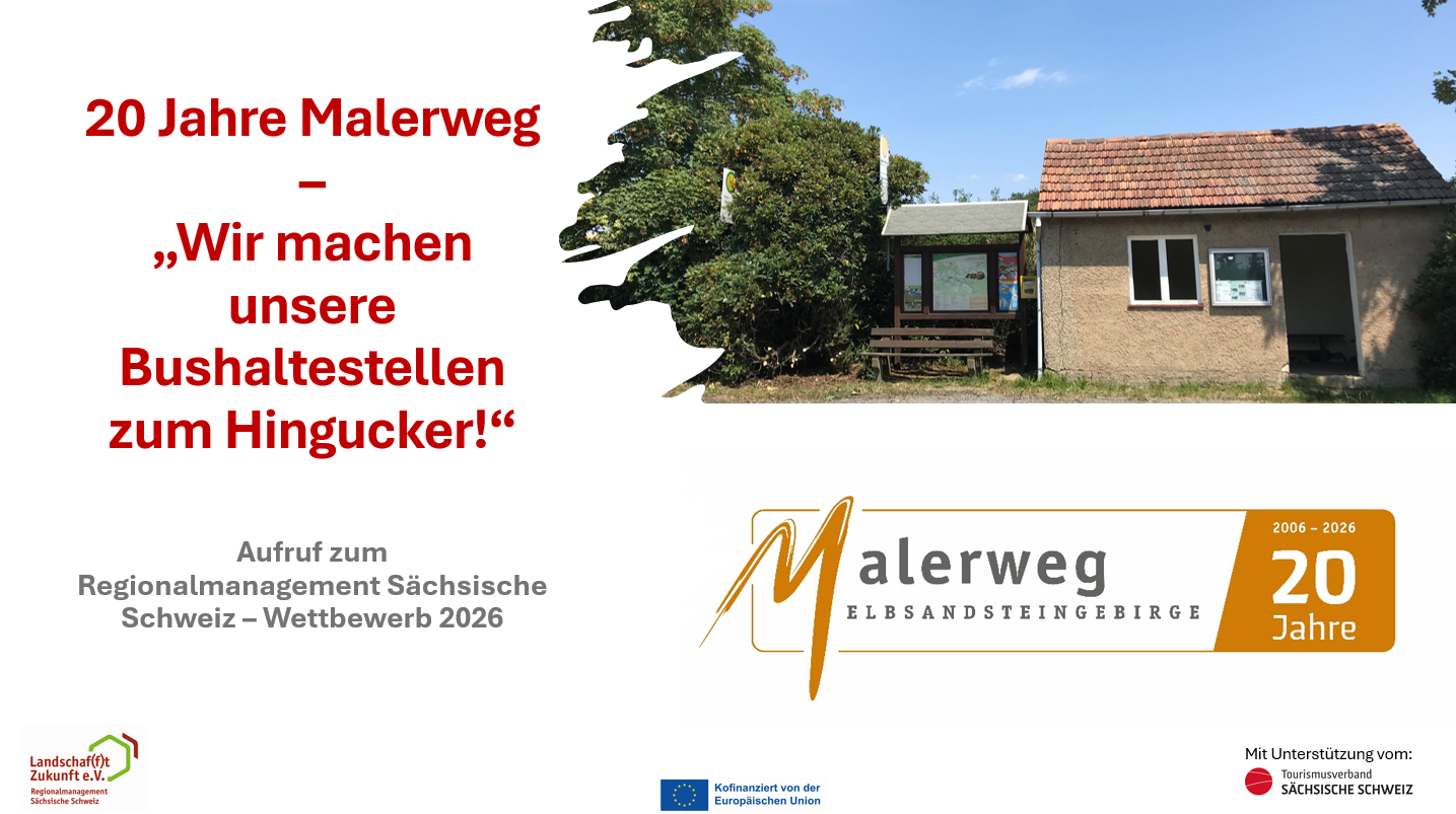 Das Regionalmanagement Sächsische Schweiz des Vereins „Landschaf(f)t Zukunft“ ruft, in Zusammenarbeit mit dem Tourismusverband Sächsische Schweiz e. V., zu einem kreativen Wettbewerb auf: „20 Jahre Malerweg – Wir machen unsere Bushaltestellen zum Hingucker!“ Gesucht werden kreative Ideen, Entwürfe und Konzepte zur Gestaltung und Verschönerung von Bushaltestellen entlang des Malerwegs in der LEADER-Region Sächsische Schweiz.