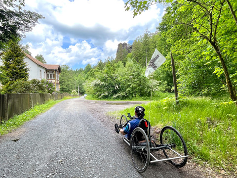 Vanaf de bushalte gaan we linksaf over de brug het dorp Rosenthal in. We klimmen gestaag en bereiken het dorpsplein op een goed geasfalteerd oppervlak, waar een weg afbuigt in de richting van Schweizermühle. We blijven echter rechtdoor rijden. We rijden door het hoger gelegen dorp naar de douane en verder langs de Schneeberger Straße naar de voetgangersgrensovergang naar Tsjechië. Daar aangekomen blijven we aan de Duitse kant en volgen de bosweg schuin naar rechts tot het volgende grote kruispunt met een wegwijzer. Hier gaat de route scherp naar rechts, aanvankelijk vrij steil, later gematigder over een breed, deels ruig wandelpad het dal van de droge Biela in. Dit dal mondt 1,5 km verderop uit in het Bielatal, waarin we rechtsaf slaan. We rollen rustig door het dal over een goed bospad tot we de Ottomühle molen bereiken. Hier hebben we eindelijk de gelegenheid om te stoppen voor een hapje eten. We vervolgen de weg, die nu weer geasfalteerd is. Op de grote parkeerplaats kun je nog steeds de bizarre rotsformaties van de Zuilen van Hercules bewonderen en dan ben je bijna bij de Schweizermühle. Na nog eens 1,4 kilometer bereik je weer het beginpunt van de tocht.