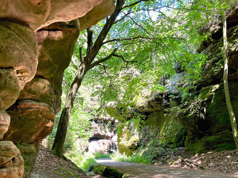 Een van de mooiste tochten in de Vordere Sächsische Schweiz is de rit van de Bastei door de rotsachtige kloven van de Rein-, Kohl- en Tscherregrund naar beneden naar Wehlstädtel aan de Elbe. Hier kun je zo dicht bij de rotsen komen als zelden tevoren, zelfs in een rolstoel of op een handbike. Het gaat niet om indrukwekkende vergezichten - want die zijn langs de route niet te vinden - maar veel meer om de ervaring van smalle, romantische rotsdalen in al hun verscheidenheid. De hier beschreven route is echter geen rondwandeling, dus bij de planning moet ook rekening worden gehouden met de logistiek.