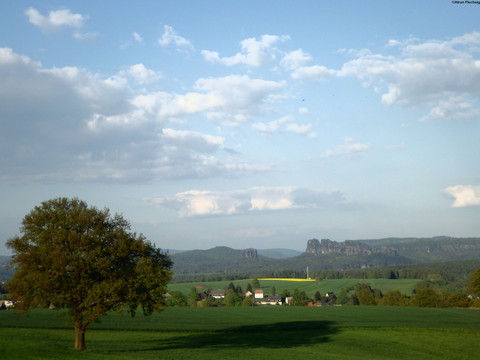 De Hunskirchen zijn klimtoppen waarvan de naam is afgeleid van het Middelhoogduits en "hoge piek" betekent. Als je echter de metalen treden links beklimt, kom je op de top van de Papststein met nog meer uitzichtpunten en de toren (momenteel niet toegankelijk). Vanaf hier heb je ook uitzicht op de Kleinhennersdorfer Stein, de Schrammsteine en de Lilienstein. Vanaf de top van de Papststein (452m) kun je het dorp Papstdorf aan je voeten zien liggen. Recht tegenover je zie je de Gohrisch en daarachter de Pfaffenstein. Verder weg zie je de Hoher Schneeberg met zijn uitkijktoren, de Zschirnsteine, Zirkelstein en Kaiserkrone, de Großer Winterberg en in Bohemen de opvallende basaltkegels van de Rosenberg en Kaltenberg.