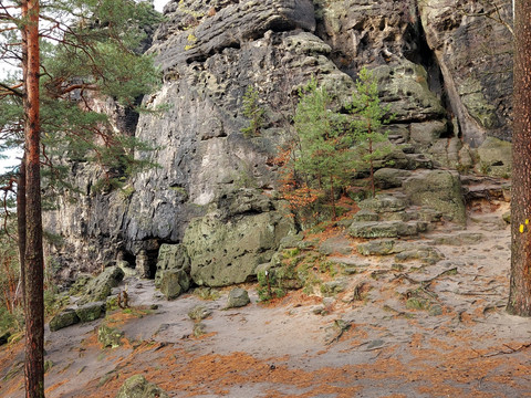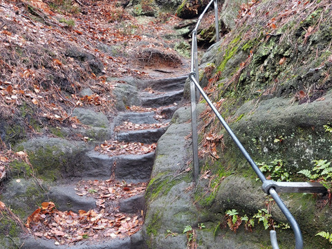 Een klein pad met zandplekken en een paar treden leidt naar de grotten van Kleinhennersdorfer Stein. Zorg ervoor dat je op de paden blijft, want je kunt overal duidelijke erosieschade zien.